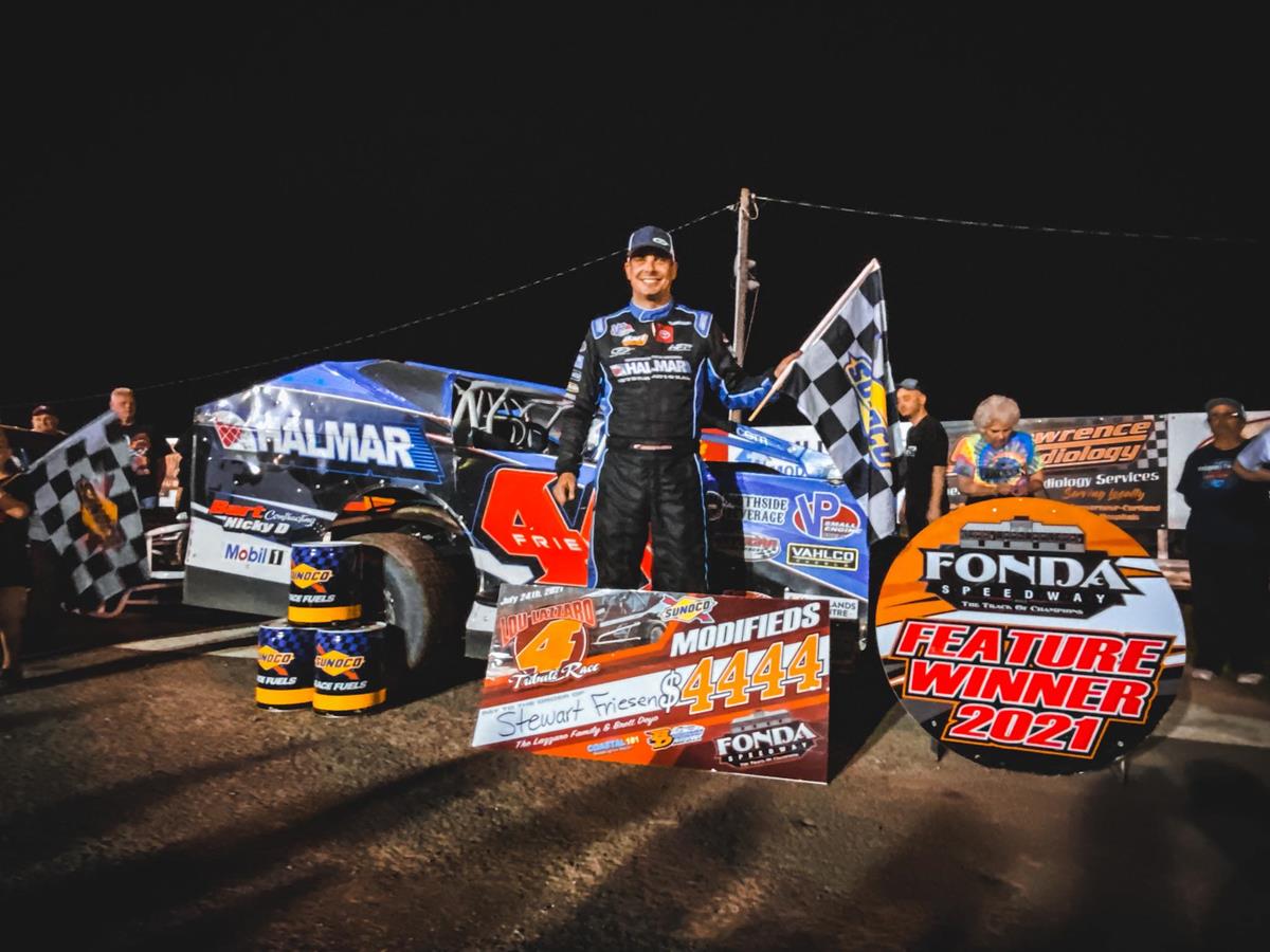 Fonda, NY – How fitting was it on Saturday evening that the #44 of Stewart Friesen and the #4 of Cody Clark were in victory lane after wins at the Fonda Speedway in the Sunoco Modified and Swagger Factory Apparel Crate 602 Sportsman respectively on a night honoring the legendary Lou Lazzaro who drove the iconic #4 during his racing career.