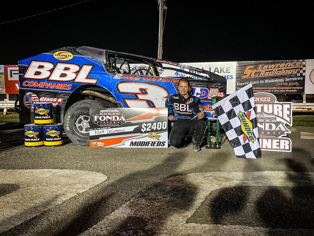Fonda, NY – After winning at the Albany Saratoga Speedway on Friday evening, Matt DeLorenzo, his brother Mike, and his teammate Brian Gleason worked all day on Saturday to get the car ready to race at the “Track of Champions� Fonda Speedway. Proof that hard work pays off was when DeLorenzo ended up in victory lane for the third time in 2022 and the 40th time in his career at Fonda.