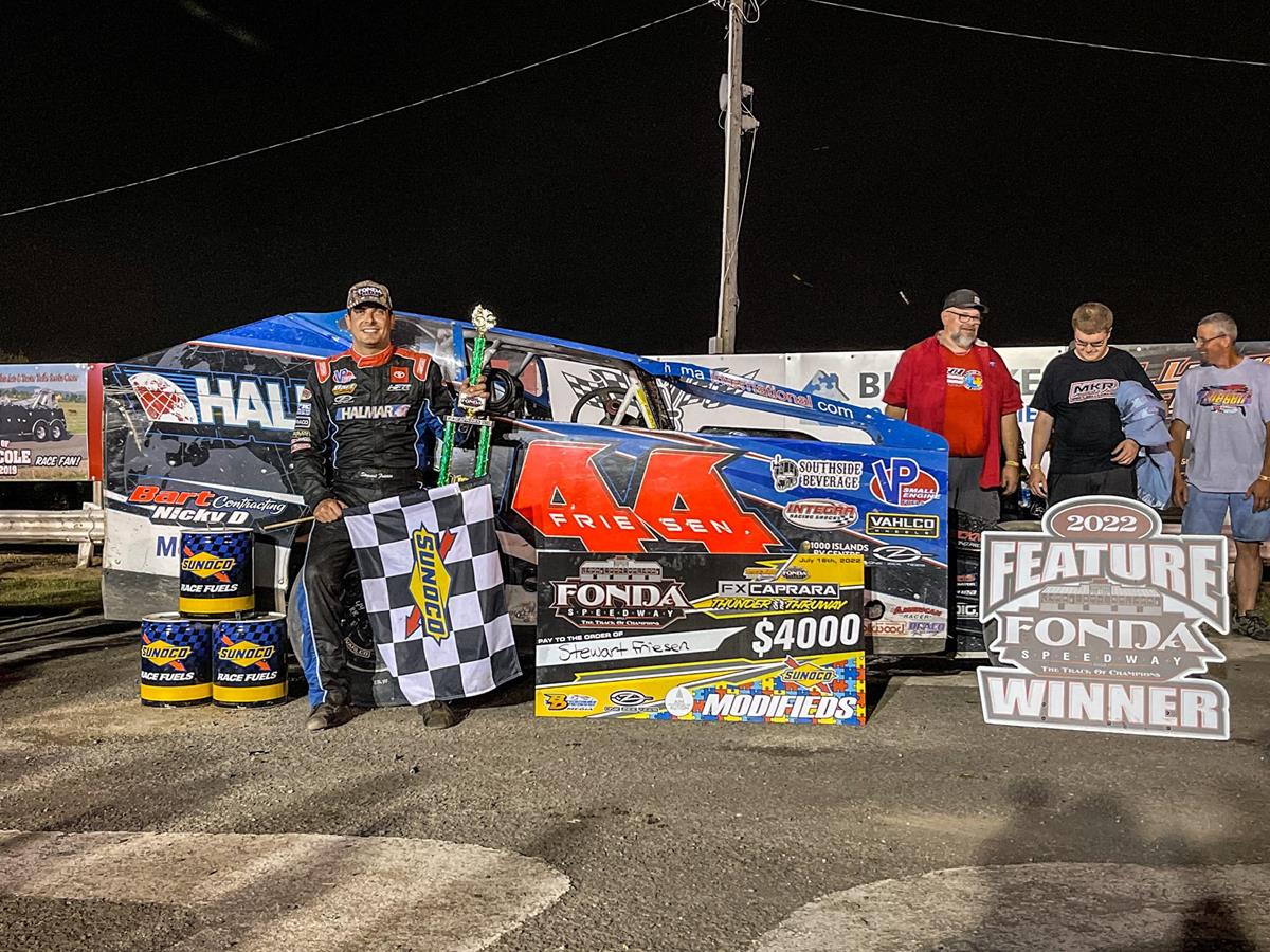 Fonda, NY – On Saturday evening at the “Track of Champions� Fonda Speedway, Stewart Friesen started the 30-lap Sunoco Modified feature in the fourth position by the luck of the draw as the event was part of the F.X. Caprara Thunder on the Thruway Series with a $4,000 pay day on the line. Shortly after lap one was completed, Friesen got up too high in turn one and scraped the wall with the right rear of his car which ended up spinning out in turn two to bring out the caution.