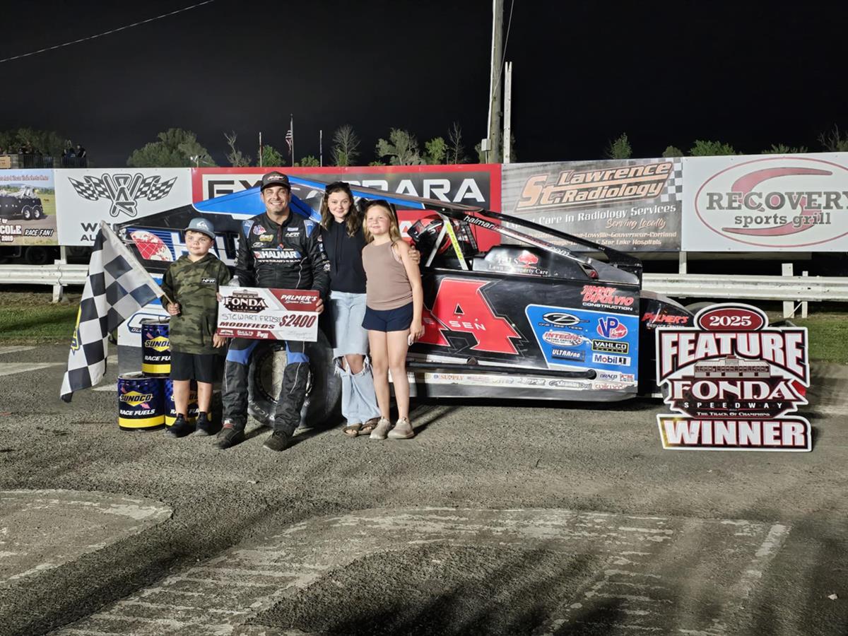 Fonda, NY – Palmer’s Service Center Night at the “Track of Champions” Fonda Speedway didn’t disappoint with great racing on a two groove race track in all division feature events. Alex Yankowski looked to be on his way to his second win of the 2025 season in the Amsterdam Truck Center 30-lap Modified main event but was nipped at the line by 0.008 seconds by Stewart Friesen who took the lead away on the final lap at the finish line.